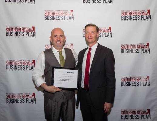 Leith Martin director of the Center for Entrepreneurship, right, thanks Dominic Anthony Marrocco for his eighth year of support of the UNLV Business Plan Competition. (Courtesy UNLV)