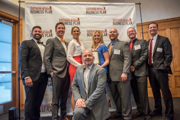 Dominic Anthony Marrocco, bottom, is seen posing with competition team FRP Innovations Pyrohalt during the 8th annual Dominic Anthony Marrocco Southern Nevada Business Plan Competition from the Fo …
