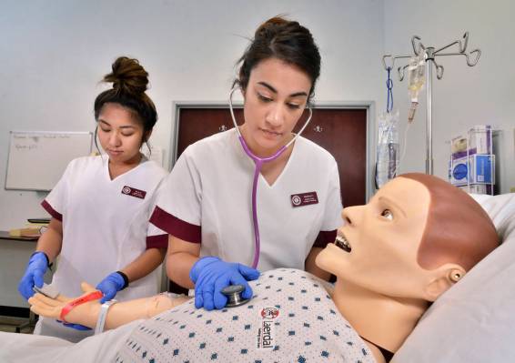 Nursing students Ryna Sagucio, left, and Marissa Cataldo work on a computerized mannequin at Roseman University of Health Sciences. (Bill Hughes Las Vegas Business Press)