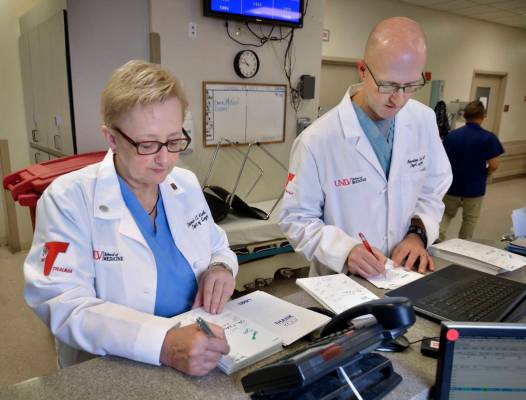 Dr. Deborah Kuhls, medical director of the UMC Trauma Center intensive care unit, and Dr. Brandon Snook, sign thank-you cards to the people who gave donations and support to the UMC Trauma Center after the Oct. 1 shooting at the Route 91 Harvest festival. (Bill Hughes Business of Medicine)
