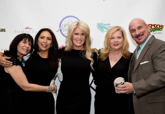 From left, Diane Paltrineri, Cynthia Cohen, Heather Kessler, Connie Lusk and Guy Melton of Woodside Homes. (Tonya Harvey Las Vegas Business Press)