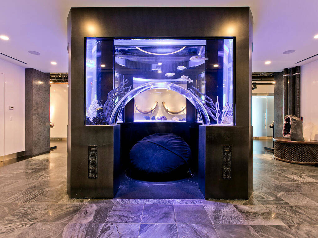 Features: By occupying the entire floor, it has 360-degree view of the entire Las Vegas Valley. Other features include: professional gym, steam room, sauna and cold plunge, catering kitchen, private wine room, bar, game room and theater. It also has a custom circular fish tank that has a bed in the middle where you can watch the fish swim around. The unit has Venetian plaster walls and all of the furniture was custom made for each room.